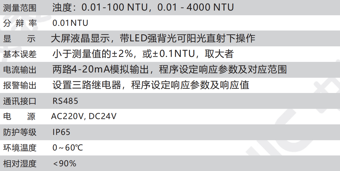 CN142-A型在線濁度儀采用光電技術、維護率低、可靠性高;多參數(shù)同時顯示,濁度值、輸出電流、時間; 中文菜單和簡便的按鍵操作;4-20mA變送輸出、繼電器控制輸出、RS485通信輸出等各種變量輸出,系統(tǒng)智能控制;上下限報警繼電器輸出。